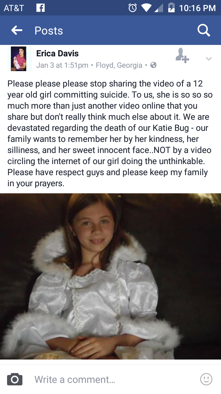 SILVER CREEK, GA – Katelyn Nichole Davis, 12, live-streamed her own suicide by hanging last Friday, and the video is about one of the most depressing things I have watched in some time.
